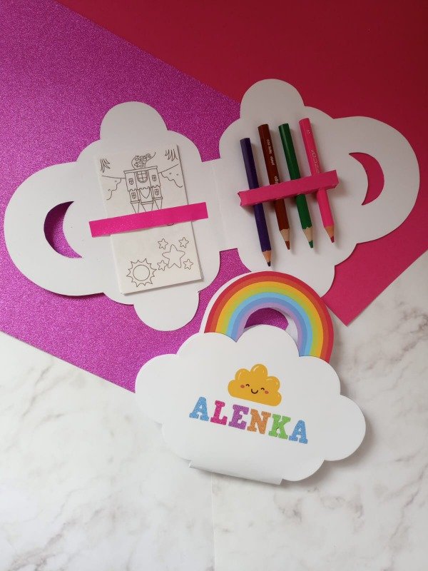 ESTILO 3 : MEDIDA 15cm x 8cm aprox ( dependiendo el diseño y la tematica) Incluye 4 lapices de colores y 8 hojitas para colorear
